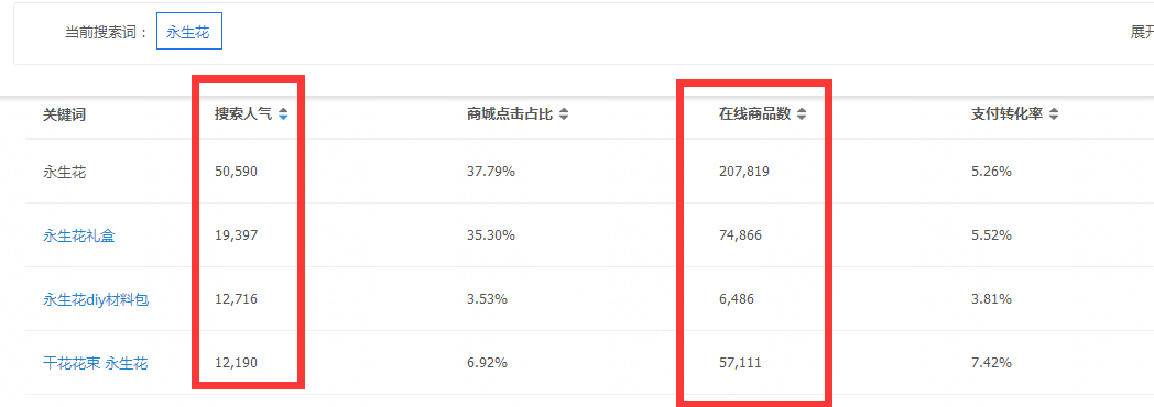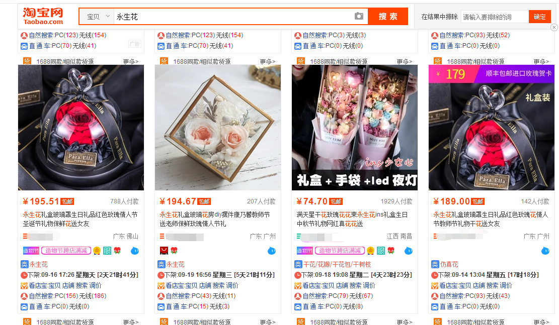 永生花为例来讲解, 假如同学是卖永生花的,由上面的a可以得出 我们首先要在买家搜索永生花的时候出现在买家面前。然而现实情况是怎样的呢?