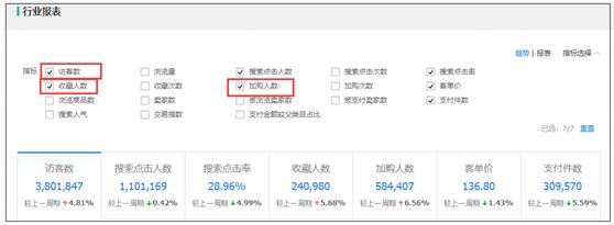 这里面有访客数、收藏人数、加购人数,你可以计算一个大概:收藏人数/访客数=收藏占比,加购人数/访客数=加购占比。然后如果你想要更多的搜索流量的扶植,让扶植期更长,这两个指标你不能比行业均值低吧。当然,根本是你产品本身的吸引力,除此之外,是不是可以搞一些活动鼓励收藏和加购呢?